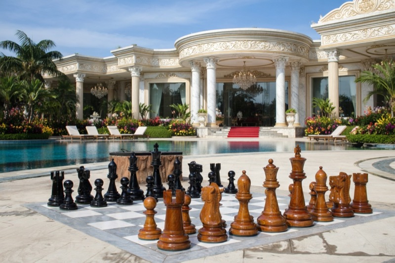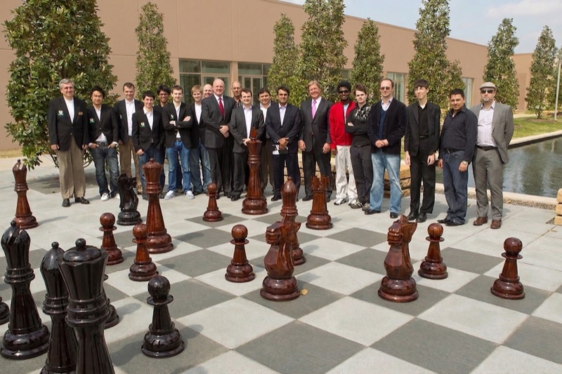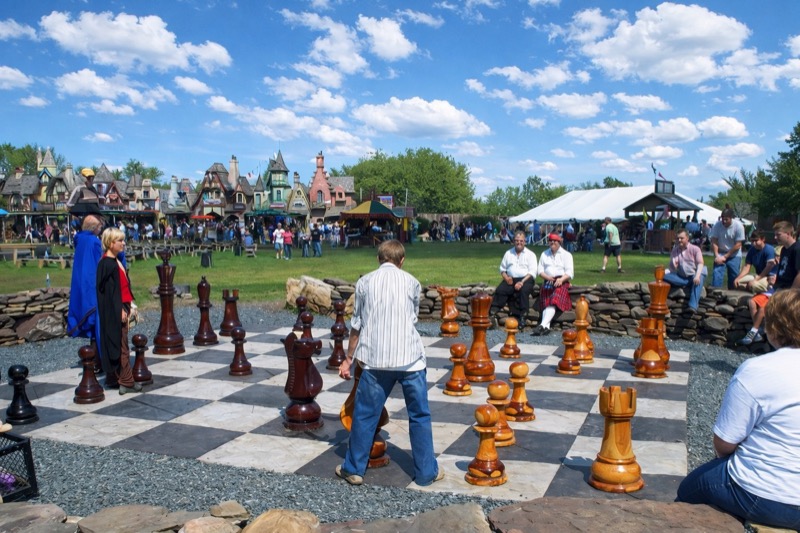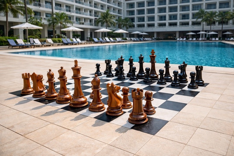 The playing surface for this chess set is a chessboard with 18" x 18" squares, and is highly suited to being played by adults in various outdoor settings, and for many different occasions. Although the pieces are quite heavy, and are not easily transportable, they can be easily shifted across the squares of the board in actual play.