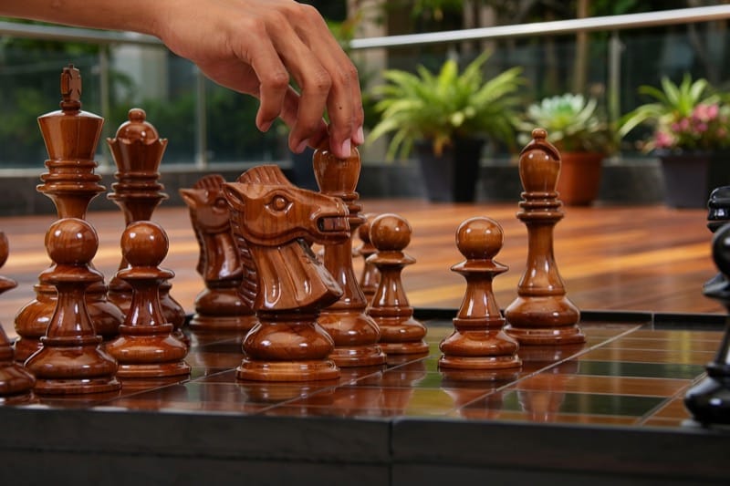 This 8″ (20cm) set is one of our best sellers. This is so not only because it is of classic design and made, as all our wooden sets, of beautiful and durable teak, but because it is suited for play in any setting, at any time, indoors or outdoors. It is easily stored and comes with portable fabric chess board with 4″ x 4″ (10cmx10cm) squares. It can all also be enjoyed with any of our beautiful teak chessboards, or chess tables (as pictured).