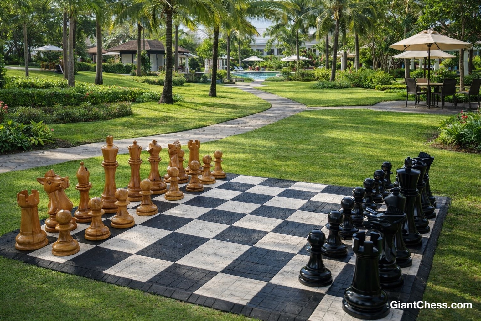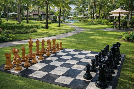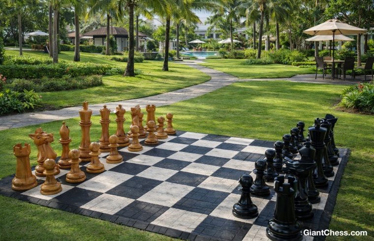 Based on the visuals from the sources, placing a giant chess set in an open area such as a garden or resort creates an incredibly elegant atmosphere. The large and majestic scale of the chess pieces makes them an artistic centerpiece amidst the lush green grass and surrounding trees. Its presence is capable of transforming an ordinary garden into a high-end recreational space reminiscent of a luxury villa.