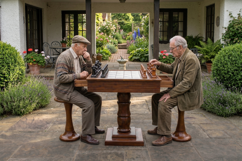 There is something timeless about the quiet joy of chess, especially when played outdoors in the company of friends or neighbors. In one serene garden setting, a pair of elderly enthusiasts sit across from each other at a beautifully crafted teakwood chess table. The board is no ordinary chessboard—it is a jumbo chess set, with the king standing proudly at 20 centimeters tall, a masterpiece produced by GiantChess.com. The atmosphere is one of leisure, companionship, and appreciation for both craftsmanship and strategy.