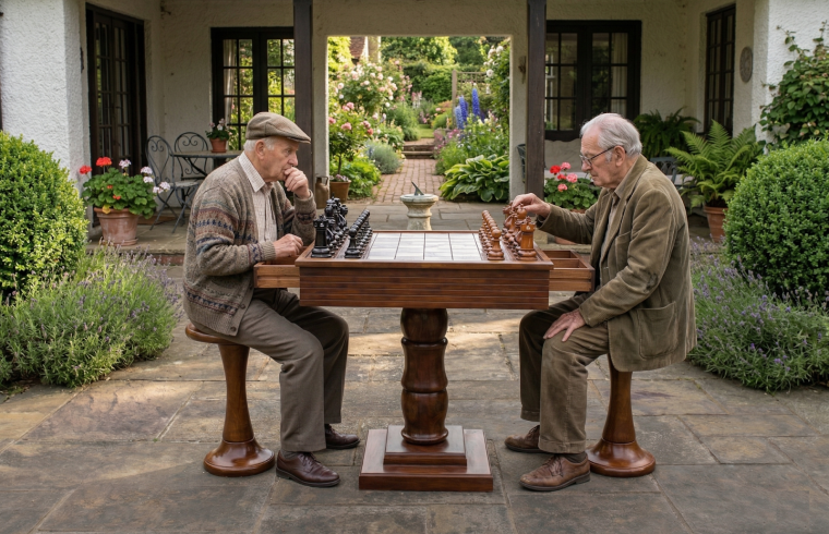 The players themselves embody the spirit of community. One wears a flat cap and patterned cardigan, the other a corduroy jacket and glasses. Their attire reflects comfort and tradition, while their concentration on the board reflects the timeless allure of chess. This is not a hurried pastime but a deliberate, thoughtful engagement—an invitation to slow down and savor the present.
