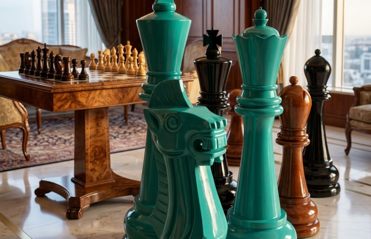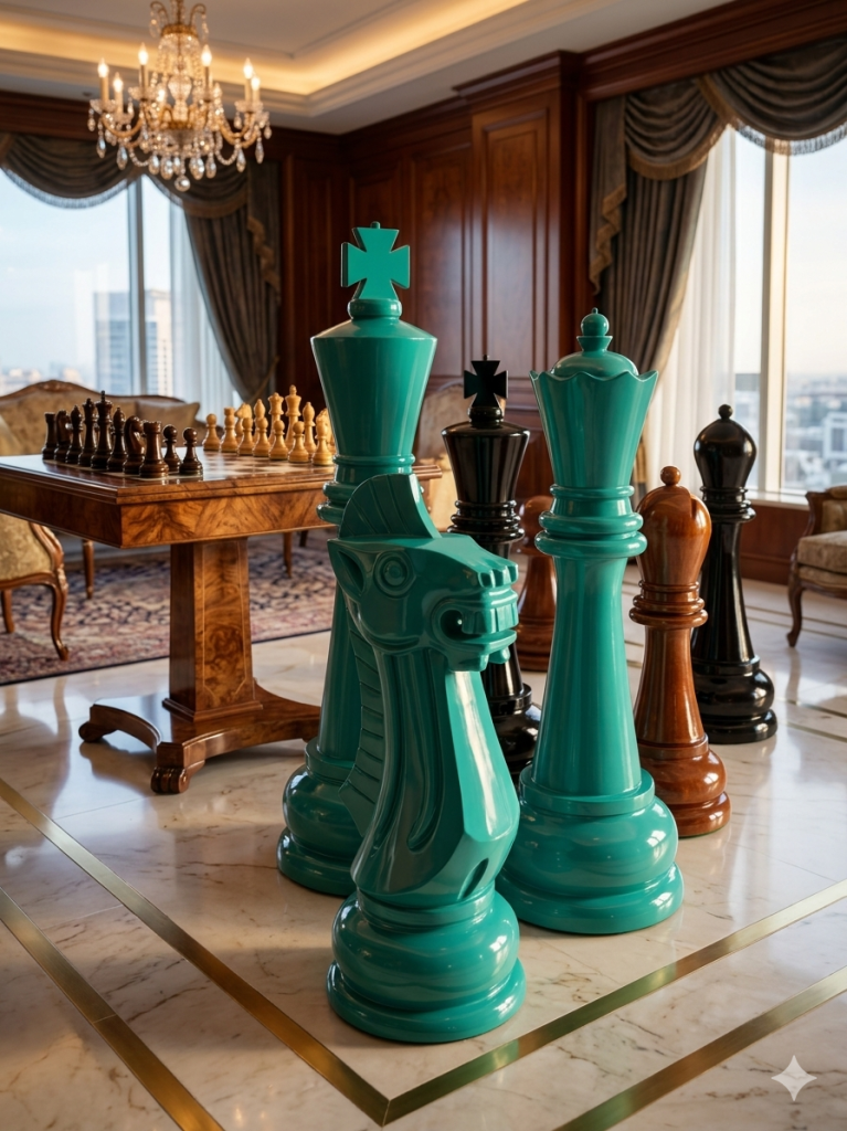 As seen in our latest collection, we aren’t afraid to push the boundaries of tradition. Imagine a grand mahogany-paneled library or a sleek, marble-floored penthouse anchored by a giant turquoise knight. By blending the organic warmth of teak with vibrant, contemporary colors, these sets become the focal point of any room. It’s a perfect blend of “Old World” sophistication and “New Age” vibrancy that demands attention the moment you walk through the door.