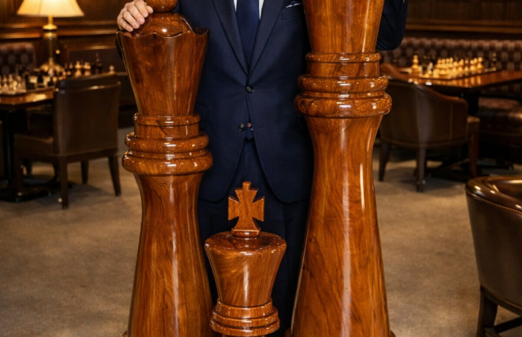 The image captures a striking scene inside an elegant chess club: a well-dressed gentleman stands confidently beside an extraordinary set of oversized chess pieces. What immediately draws attention is not just the refined setting, but the sheer scale and craftsmanship of the giant chess set itself. These are not ordinary pieces—they are monumental works of art, carved from premium teak wood and designed to command presence in any space.