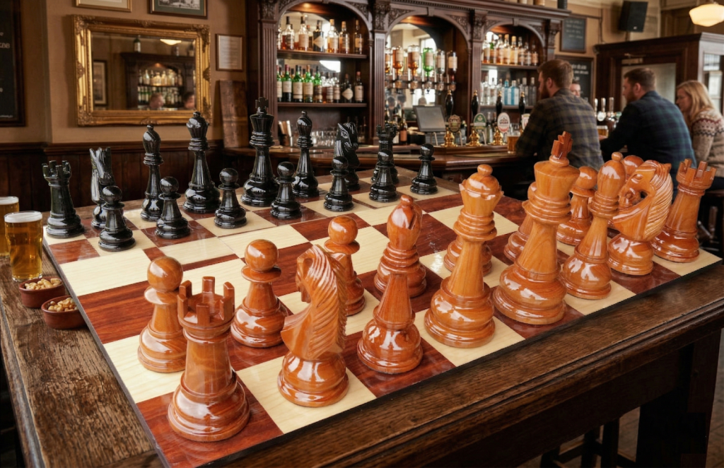 In the warm ambiance of a bustling pub, two guests lean over a table, their eyes fixed on a grand chessboard where polished teakwood pieces stand proudly. The king rises 20 centimeters tall, commanding attention as beer glasses glisten nearby. This is not just a game—it’s an experience, a conversation starter, and a symbol of refined leisure. The teakwood giant chess set from GiantChess.com transforms ordinary spaces into extraordinary ones.