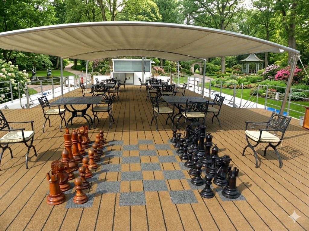 Imagine the gentle breeze of a garden terrace or the steady hum of a luxury cruise deck, enhanced by the presence of a game that transcends time. In our latest showcase at giantchess.com, we highlight a stunning Giant Teak Chess Set perfectly integrated into a high-end outdoor lounge. This isn’t just about entertainment; it’s about creating an atmosphere where luxury and leisure meet in the most artistic way possible.