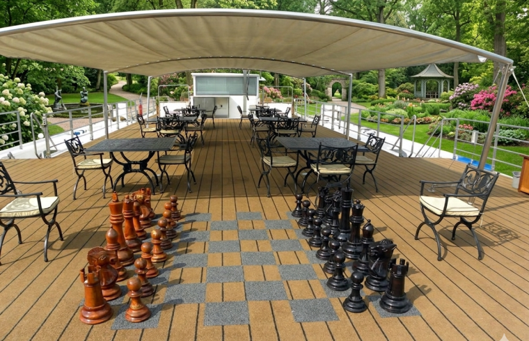 The integration of the board directly into the deck flooring—as seen in the image—shows a clever approach to modern landscape design. By using alternating tiles or deck patterns to create the board, the game becomes a seamless part of the architecture. Our team at giantchess.com specializes in providing the pieces that bring these custom-built boards to life, ensuring that the scale and quality of the chessmen match the grandeur of the surroundings.