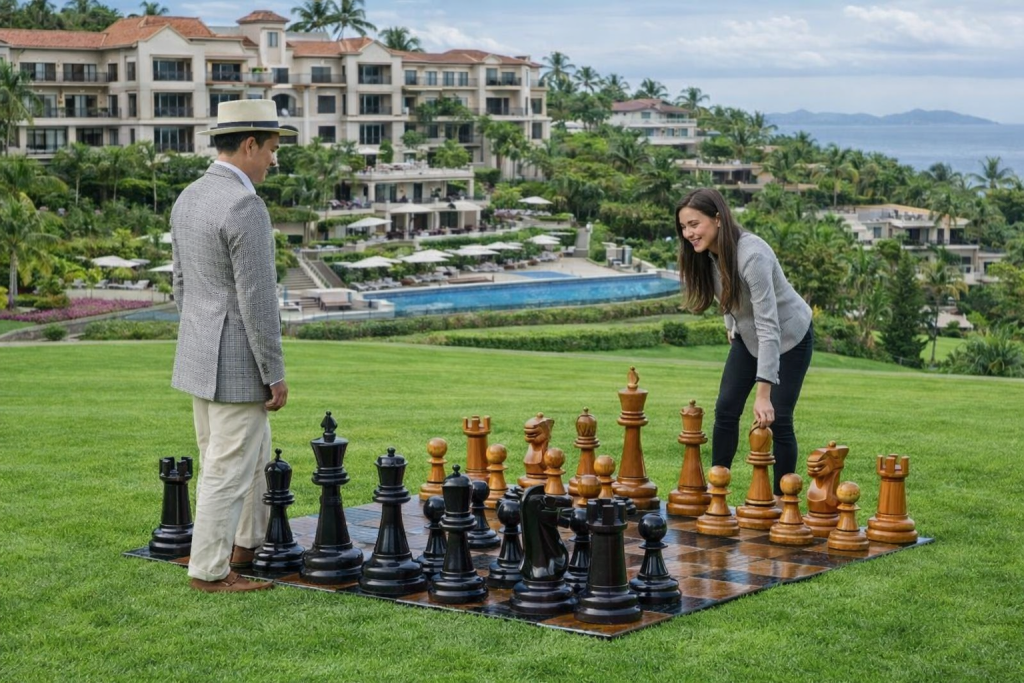 There are moments in travel when leisure transcends into art — when a simple pastime becomes a statement of taste. On the manicured lawn of a world-class resort, two young guests pause amid the serenity of tropical air, their attention fixed on an extraordinary chessboard carved from solid teak. Each piece gleams under the soft sunlight, its natural grain revealing the craftsmanship that defines GiantChess.com.