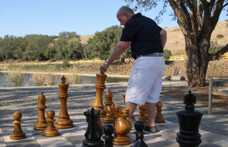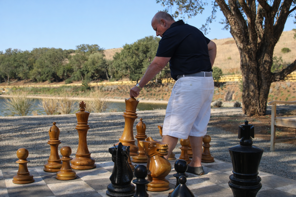 Under the wide Texas sky, where the breeze carries the scent of oak and sun‑warmed earth, a game of chess becomes a statement of elegance. Beside a tranquil lake, the oversized teakwood pieces from GiantChess.com stand proudly on a grand outdoor board — each one polished to perfection, each move echoing the rhythm of thoughtful leisure.