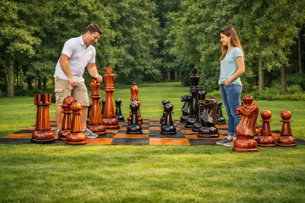 There’s something undeniably captivating about the union of craftsmanship and leisure. In a serene park surrounded by towering trees and emerald lawns, a game of giant chess unfolds—not merely as a pastime, but as a statement of elegance. The oversized teakwood pieces gleam under the warm sunlight, their polished surfaces reflecting the artistry of GiantChess.com, the world’s leading manufacturer of wooden giant chess sets.