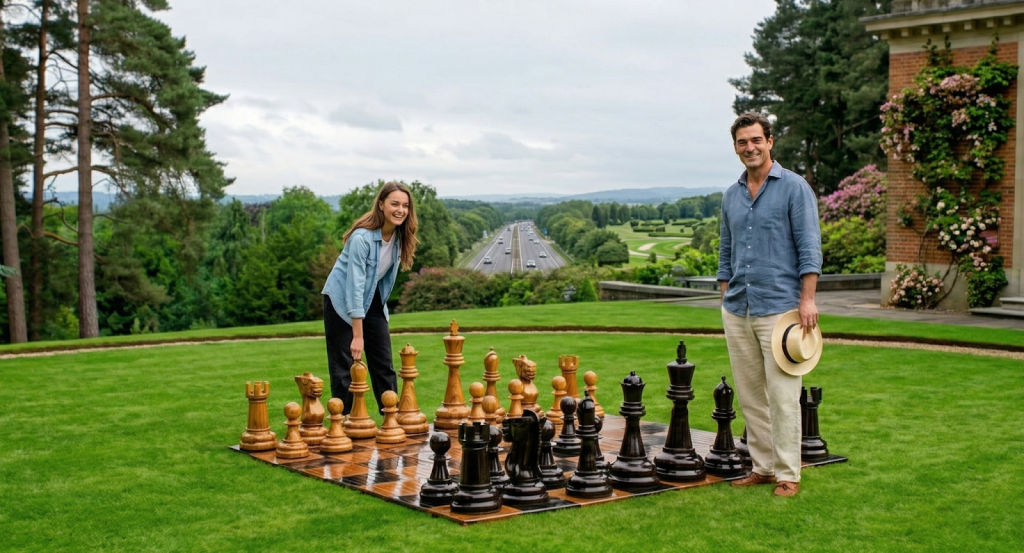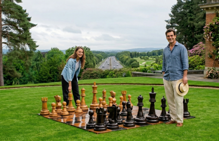 The atmosphere is pure indulgence. The air carries the scent of fresh grass and distant blossoms, while the surrounding architecture whispers luxury and calm. Here, chess becomes more than a pastime — it’s a ritual of refinement. Every move across the board reflects the harmony between craftsmanship and contemplation, between human intellect and the serenity of the outdoors.