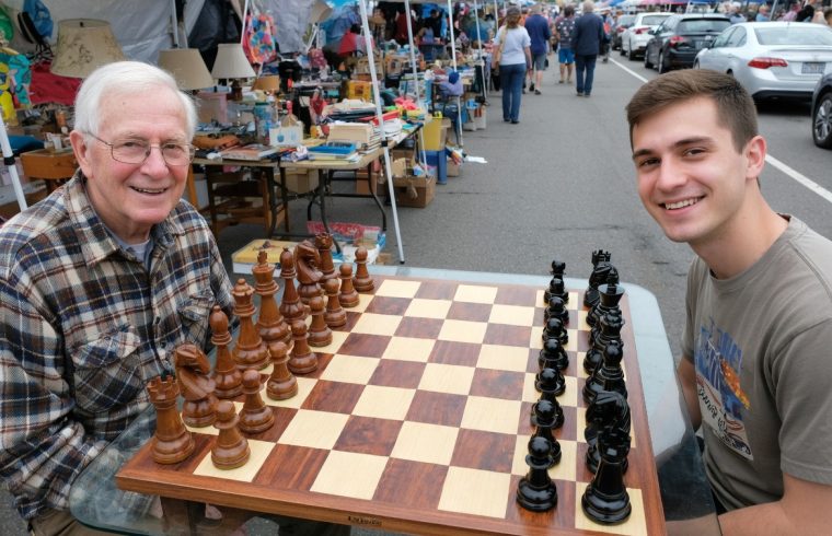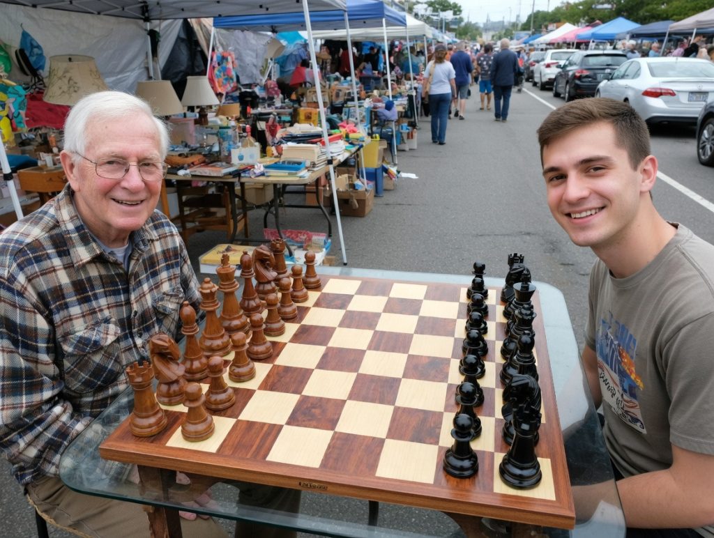 Garage sales are more than just places to hunt for bargains — they can also become unexpected hubs for community fun and friendly competition. Imagine strolling down a bustling street lined with tents, vintage treasures, and parked cars, when suddenly you spot a beautiful oversized chessboard with two smiling players ready for a match. In the scene above, an elderly gentleman and a young man are happily seated across from each other, about to begin a game on a stunning 20cm giant teak chess set right in the middle of a lively garage sale.