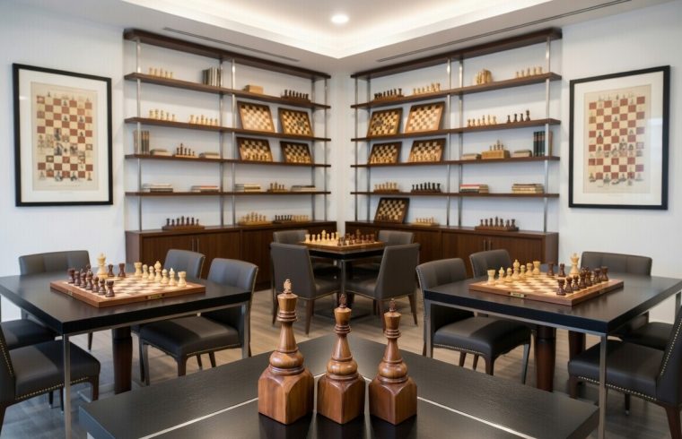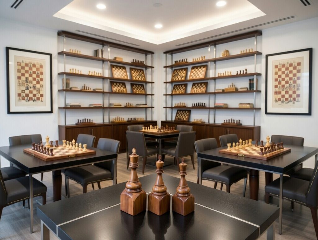 We photographed these trophies in a sleek, modern chess club setting. The clean lines of the dark minimalist tables and contemporary furniture provide a perfect contrast to the warm, organic beauty of the carved wood. This juxtaposition highlights how traditional craftsmanship can shine even more brightly in a modern environment.