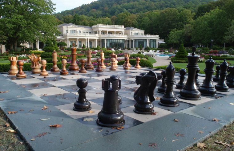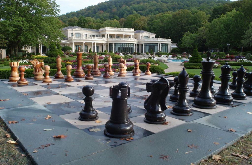 Beyond the chessboard, the scenery is nothing short of breathtaking. A grand white mansion with classical columns and sweeping balconies presides over manicured gardens bursting with colorful flowers. Neatly trimmed hedges, vibrant flowerbeds, and a sparkling swimming pool in the distance complete this luxurious tableau, making the entire setting feel like a private paradise.