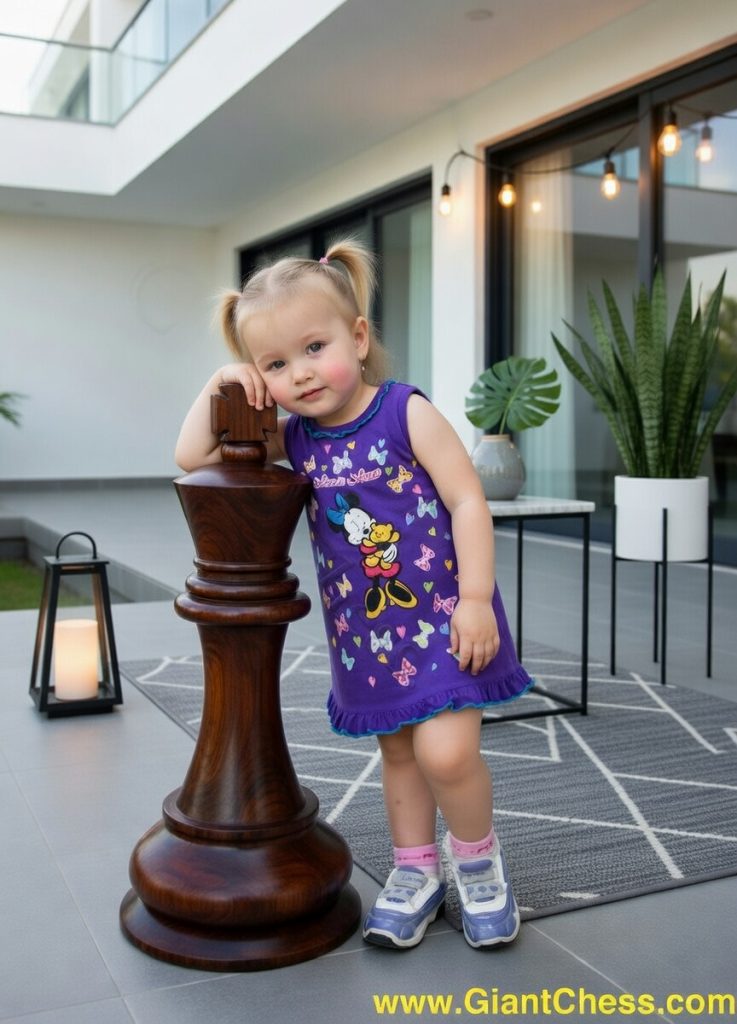 Recently, we captured a truly heartwarming scene featuring this impressive giant chess king. A charming little blonde girl in her vibrant purple Minnie Mouse dress stands beside the towering piece, resting her cheek on her hand with an expression full of curiosity and innocence. Her bright eyes and golden pigtails perfectly contrast with the deep, sophisticated tones of the chess king, creating a delightful mix of childhood wonder and timeless elegance.