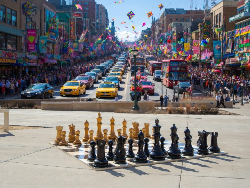 What makes this image so special is how it blends two completely different worlds: the quiet focus of chess with the loud, joyful energy of a city festival. It reminds us that strategy and fun can coexist beautifully — even in the most unexpected places.