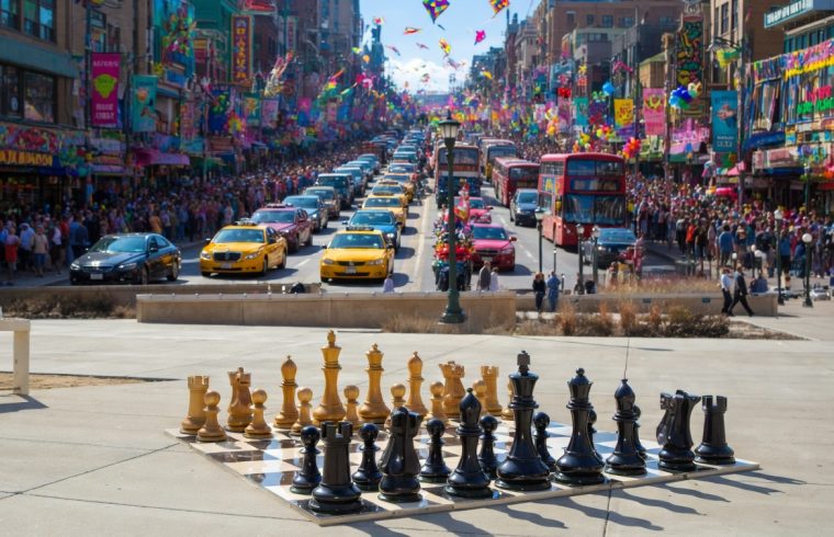 In the heart of a bustling city, where traffic flows endlessly and colorful festivities light up the sky, something extraordinary stands out: a massive, life-sized chessboard with towering chess pieces.
