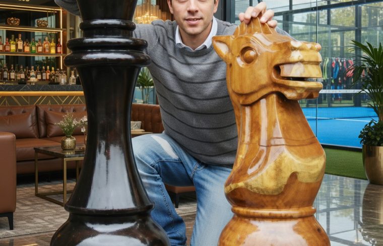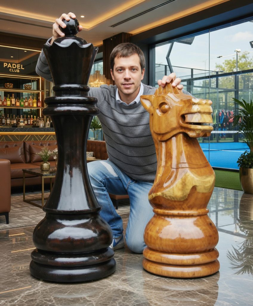 Step into a lounge where leisure and sophistication intertwine, and you will find yourself captivated by the presence of oversized chess pieces carved from teakwood. The scene is striking: a towering king and a noble knight, their scale commanding attention, their craftsmanship radiating elegance. Against the backdrop of sleek leather seating and glass walls revealing a padel court, the chess pieces transform the atmosphere into one of cultured refinement.