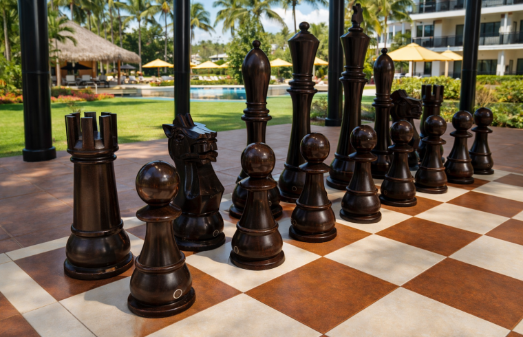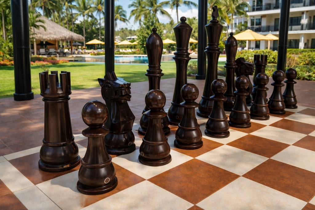 Under the soft glow of tropical sunlight, a magnificent set of teakwood chess pieces stands proudly upon a pristine board—each piece carved with precision and grace, exuding timeless craftsmanship. The king rises to an impressive height of 72 inches, commanding attention as the centerpiece of this luxurious outdoor tableau.