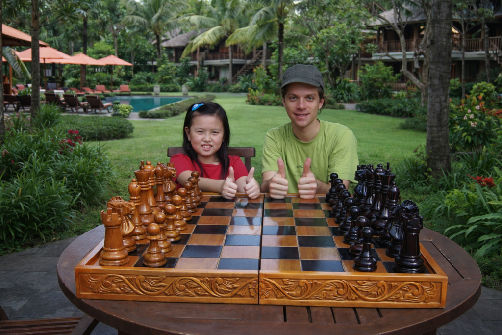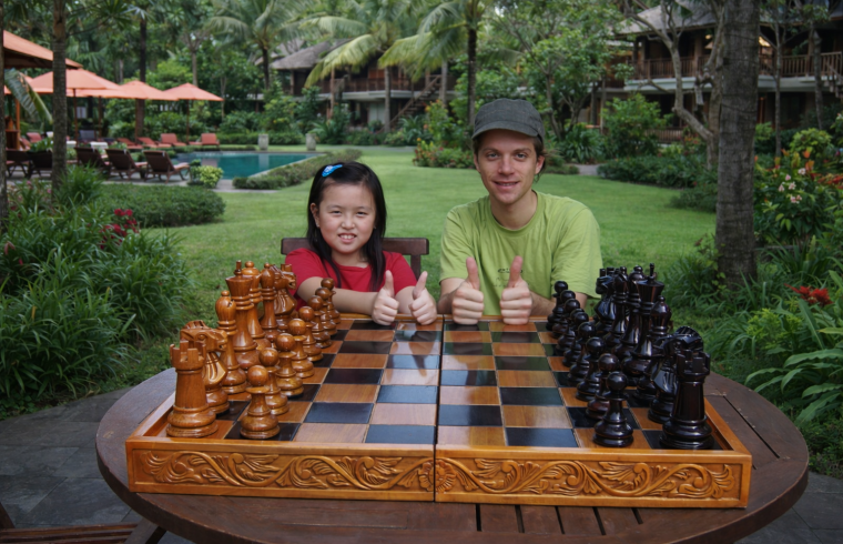 In the heart of a serene resort garden, this handcrafted teakwood chess set becomes the centerpiece of leisure and sophistication. The matte-finished board, framed with intricate carvings, reflects the artistry and heritage of Indonesian craftsmanship. Surrounded by lush greenery, flowering plants, and elegant bungalows, the scene evokes a sense of calm and exclusivity—perfect for guests seeking mindful recreation in a luxurious setting.
