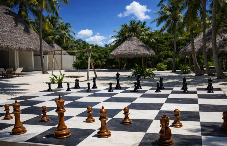 As guests stroll past the thatched-roof villas and shimmering pools, the sight of the giant chessboard evokes a sense of grandeur. Families gather, friends challenge one another, and couples pause to admire the sculptural beauty of the pieces — each move on the board echoing the rhythm of the waves nearby.