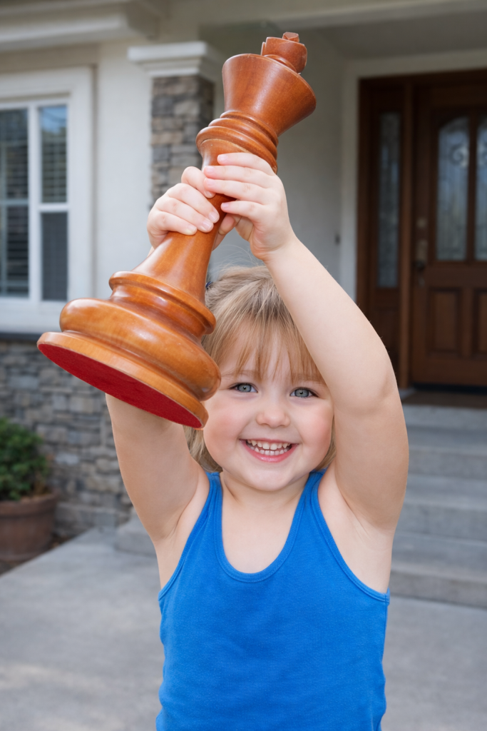 In front of a charming suburban home, a young girl lifts a majestic wooden chess king high above her head, her smile radiant with pride and wonder. The scene captures more than just play—it embodies the spirit of discovery and imagination that GiantChess.com brings to families worldwide. The polished mahogany tones of the chess piece gleam under the daylight, symbolizing craftsmanship and timeless elegance. This moment transforms a simple game into a celebration of artistry and childhood joy.
