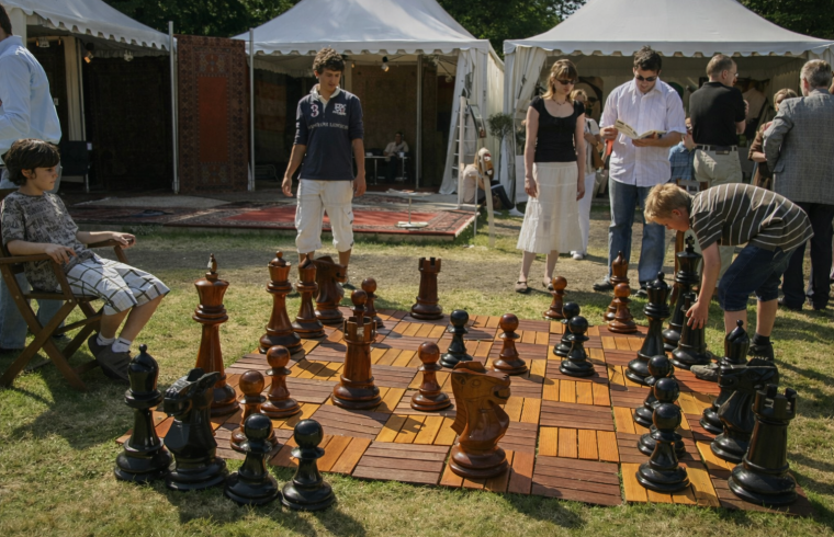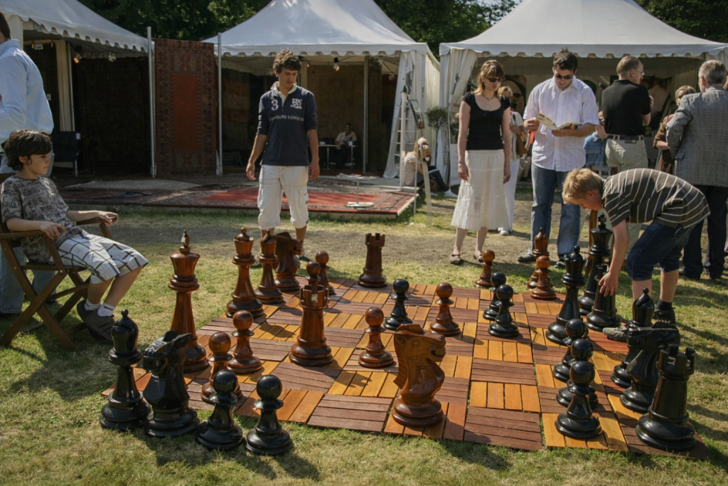 Luxury tents in the background frame the scene with subtle refinement, suggesting an atmosphere of curated leisure—where every detail, from the texture of the wood to the placement of each piece, reflects thoughtful design. The chessboard becomes the heart of the occasion, drawing attention not through extravagance but through authenticity and craftsmanship.