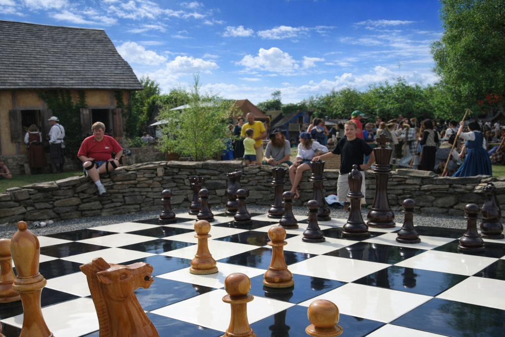 The outdoor setting amplifies the grandeur. Under a blue sky brushed with white clouds, the towering chess pieces stand as sentinels of creativity and leisure. Guests gather around, drawn by the spectacle of scale and the allure of craftsmanship. The scene becomes a living tableau — a fusion of nature, design, and human connection.