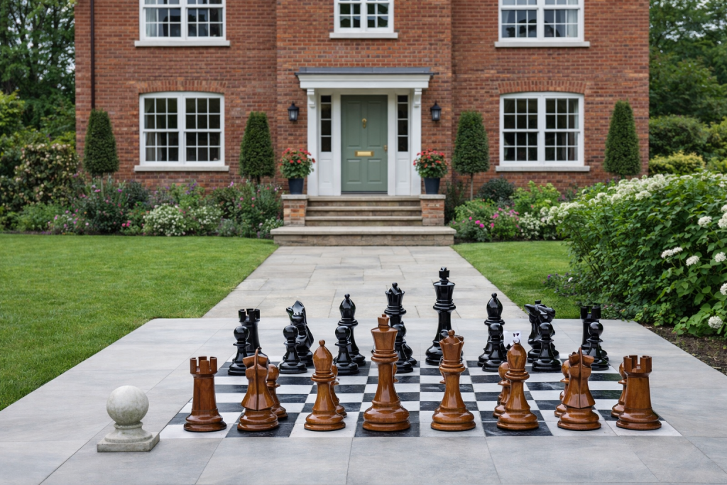 In the serene front yard of a stately brick home, a magnificent chessboard commands attention — not merely as a game, but as a statement of taste. The polished teakwood pieces, each carved with precision and grace, stand proudly against their glossy black counterparts. Together, they form a tableau of intellect and artistry, inviting both contemplation and admiration.