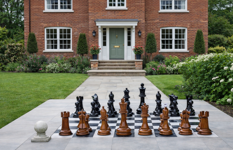 In this setting, the chessboard becomes more than a pastime. It transforms into a centerpiece of conversation, a focal point for gatherings, and a symbol of refined living. The clean lines of the house and the manicured garden complement the board’s geometry, creating a seamless dialogue between architecture and art.