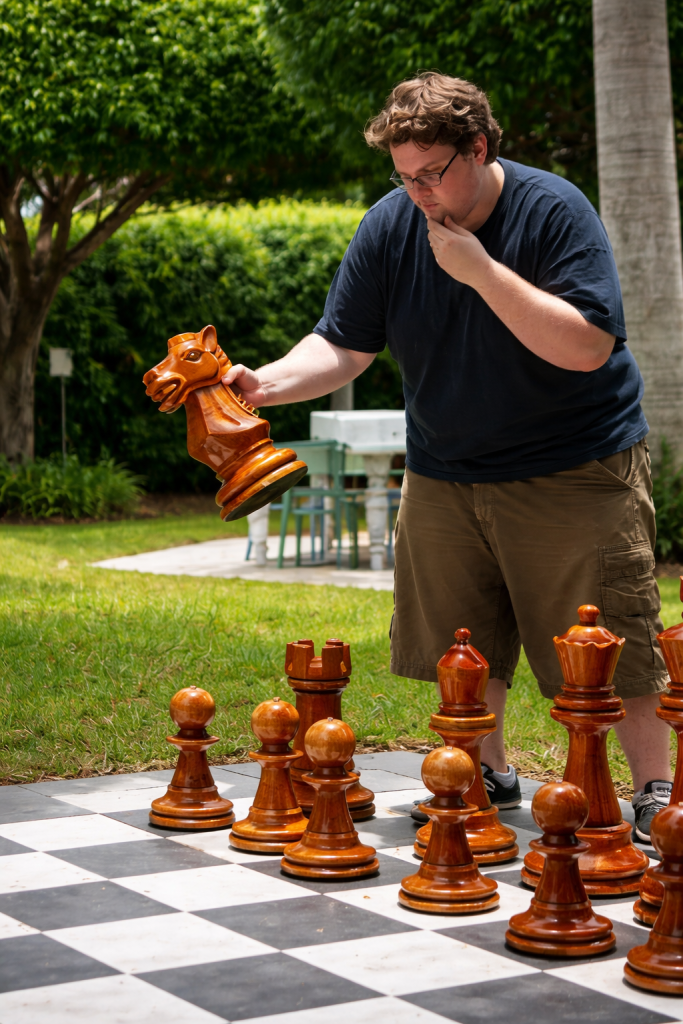 The scene of a player lifting a polished knight under the open sky captures the essence of GiantChess.com’s philosophy: that play can be art, and art can be play. The tactile connection between hand and wood evokes a sense of mindfulness — a reminder that luxury is not only seen but felt.
