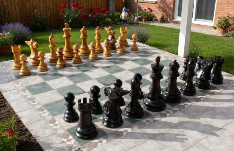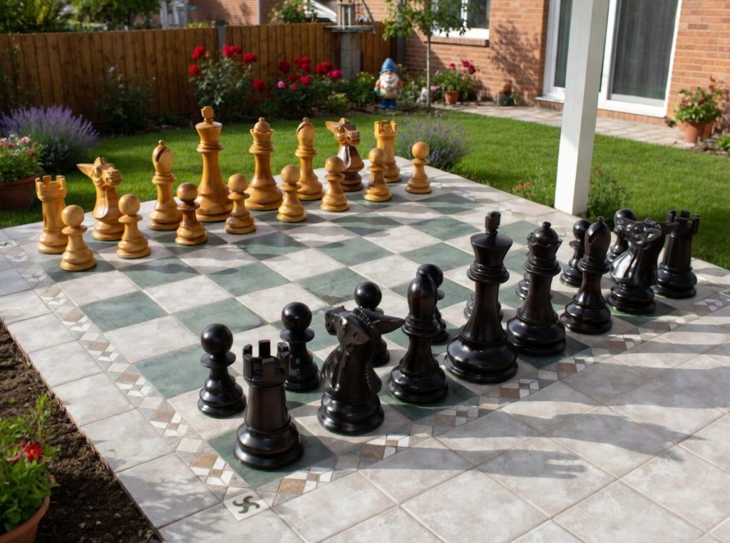In the heart of a peaceful suburban backyard, a majestic chessboard comes to life under the warm sunlight. Oversized wooden chess pieces stand proudly on a beautifully tiled board, creating a striking contrast between the light golden tones of one army and the deep, rich black of the opposing side. This is no ordinary game — it is a grand outdoor chess experience that transforms an ordinary garden into a battlefield of strategy and elegance.