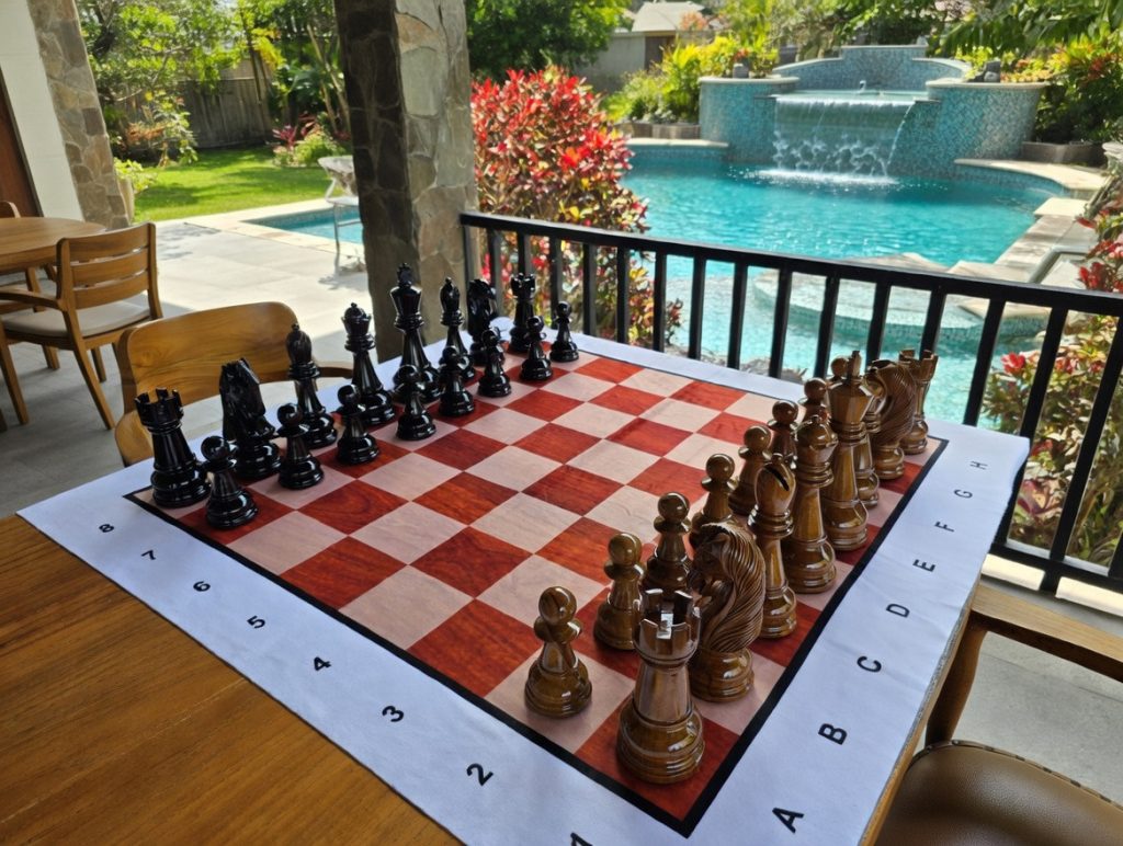 Ultimately, the photograph captures more than a game in progress. It conveys a philosophy: that leisure, when paired with craftsmanship, becomes luxury. The teakwood chess set from GiantChess.com is not just about playing—it is about living beautifully, with elegance woven into every move.
