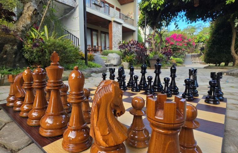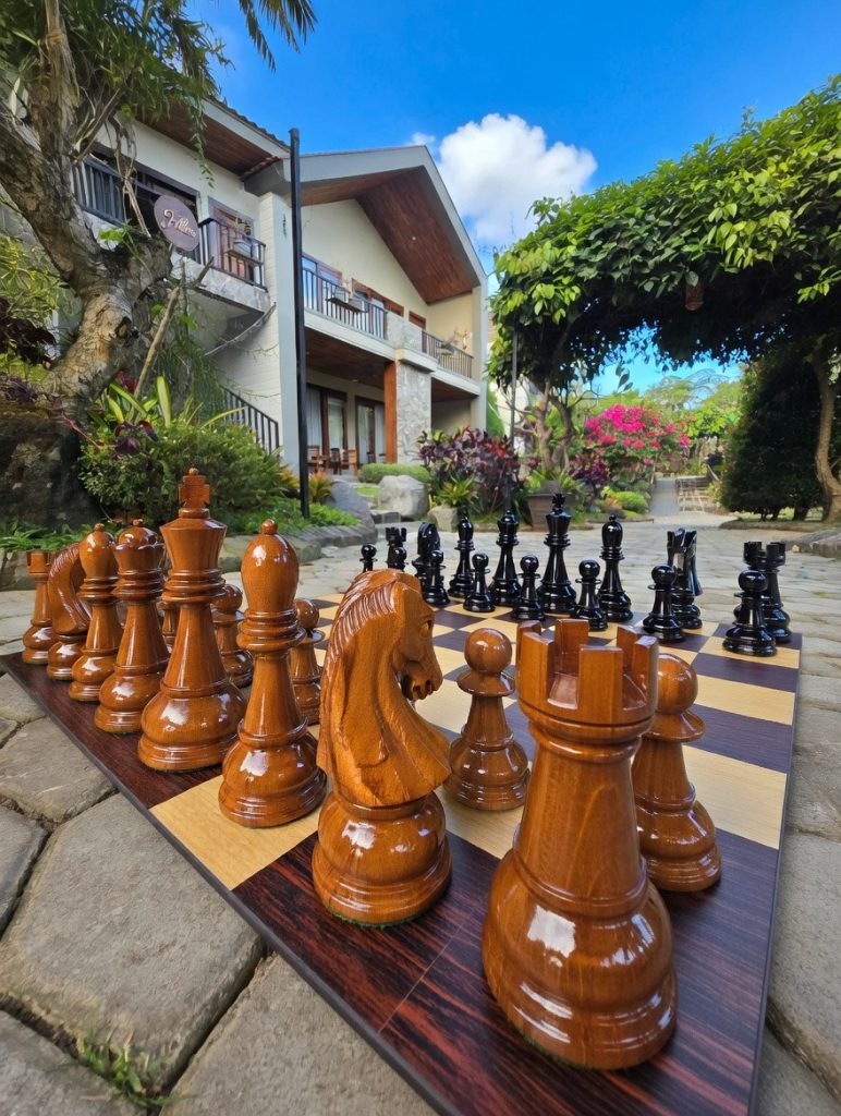 On a sunlit stone patio, a giant chessboard stretches across the ground, its alternating light and dark squares gleaming under the clear blue sky. Upon it stand polished wooden and dark-toned chess pieces, their forms bold and elegant against the natural backdrop. The scene is framed by a two-story building with a wooden roof and stone columns, surrounded by lush greenery and flowering plants. It is a setting that blends human craftsmanship with the beauty of nature.