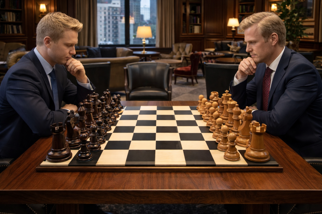The players, dressed in tailored business suits, embody the symbolism of chess as a metaphor for decision-making and competition. Their poised demeanor suggests that this match is not merely recreational but reflective of deeper themes: leadership, foresight, and the balance of risk and reward. In such a setting, the game becomes an allegory for corporate strategy, where every move carries weight.