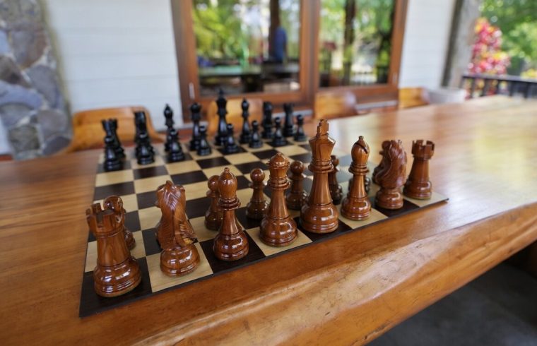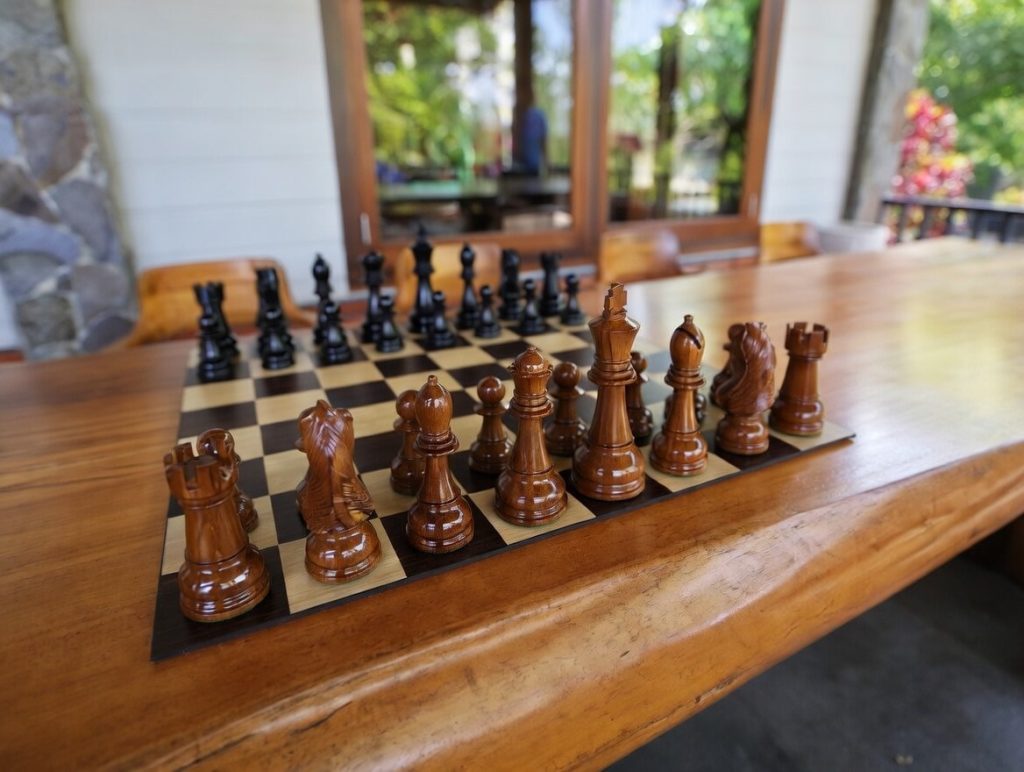 On a polished wooden table, a chessboard awaits its players. The pieces are aligned in their starting positions, each side ready for the timeless contest of intellect and imagination. Light brown teakwood pieces face their counterparts in deep black, creating a striking contrast that immediately draws the eye. The board itself, framed by natural light streaming through a nearby window, becomes a stage for strategy and elegance.