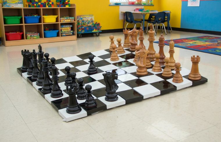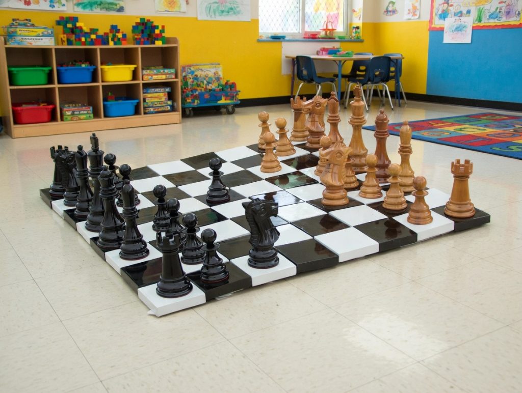 Inside a bright classroom painted in cheerful yellow and blue, a remarkable sight captures attention: a large floor chessboard with oversized pieces arranged neatly in their starting positions. Black and light brown sets stand ready for play, their polished surfaces gleaming under the light. The board dominates the center of the room, transforming the classroom into a space where strategy and creativity meet.