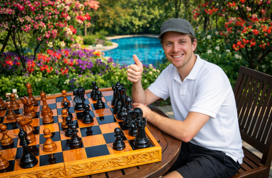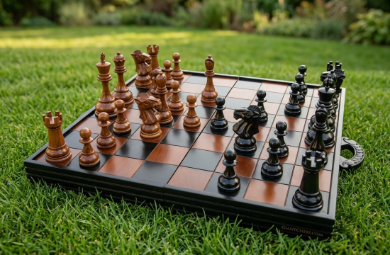 On a manicured grassy lawn, a grand chessboard stretches across the ground, its alternating squares inviting players to engage in a timeless contest of intellect. Oversized chess pieces, polished in warm teakwood and deep black…