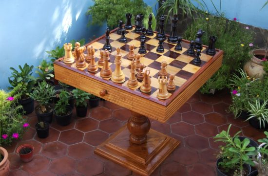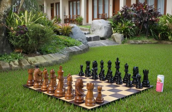 In the heart of a sunlit garden, the grandeur of a giant teakwood chessboard commands attention—a masterpiece of craftsmanship and timeless allure. Each piece, polished to perfection, stands proudly upon the board, reflecting the artistry…