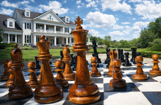 In the tranquil backyard of a grand mansion, a life-sized chessboard stands as both a game and a work of art. The polished wooden pieces gleam under the bright blue sky, their reflections dancing on…