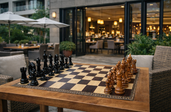 In the world of hospitality, every detail speaks volumes about a hotel’s character. The outdoor restaurant scene captured here tells a story of sophistication and leisure — a marble-topped table set for a timeless game…