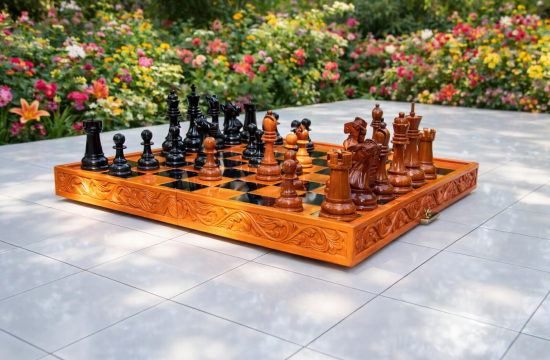 In the heart of a serene garden where blossoms dance under the sunlight, a magnificent teakwood chess set commands attention. Each piece, carved with precision and polished to a warm, uniform hue, stands proudly upon…