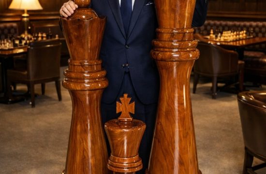 The image captures a striking scene inside an elegant chess club: a well-dressed gentleman stands confidently beside an extraordinary set of oversized chess pieces. What immediately draws attention is not just the refined setting, but…