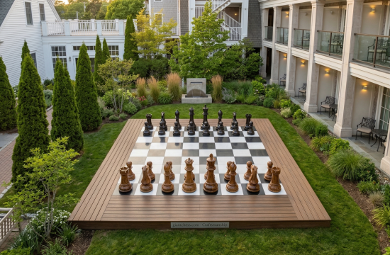 In the heart of a landscaped courtyard, a giant chessboard rises on a wooden platform, surrounded by greenery and elegant architecture. Oversized teakwood pieces stand ready for play, their craftsmanship immediately capturing the eye. This…