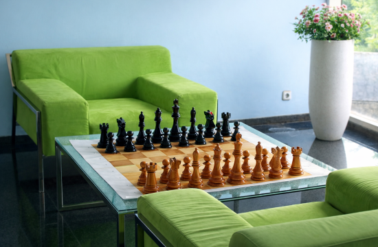In a contemporary lounge filled with light and color, a wooden chessboard rests gracefully on a glass coffee table. Two bright green armchairs frame the scene, inviting guests to sit, relax, and engage in a…
