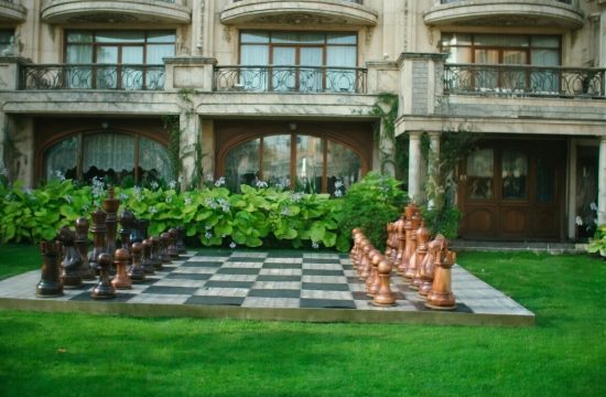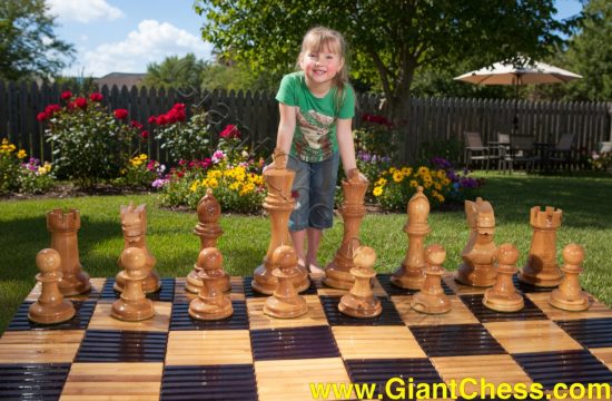 In the quiet elegance of a private garden, a scene unfolds that transcends leisure and becomes art. Oversized teakwood chess pieces, polished to perfection, stand proudly upon a grand board, their natural grain catching the…
