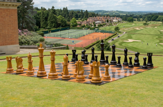 On a manicured lawn framed by elegant hedges and a modern home, a giant chessboard gleams in black and white. Oversized teakwood pieces stand proudly, their polished surfaces catching the sunlight as they await the…