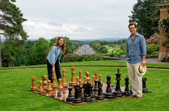 There’s a certain elegance in slowing down — in letting the mind wander between strategy and scenery. On a lush green lawn overlooking rolling hills and a tranquil resort landscape, a pair of travelers pause…