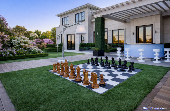 On a manicured lawn framed by elegant hedges and a modern home, a giant chessboard gleams in black and white. Oversized teakwood pieces stand proudly, their polished surfaces catching the sunlight as they await the…