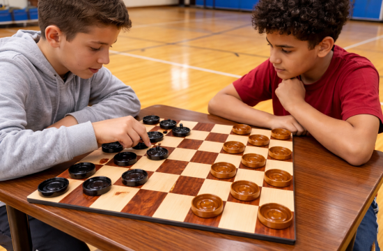 In the heart of a school hall, where polished wooden floors reflect the energy of countless activities, two young students sit across from each other at a sturdy teakwood table. Between them rests a checkers…