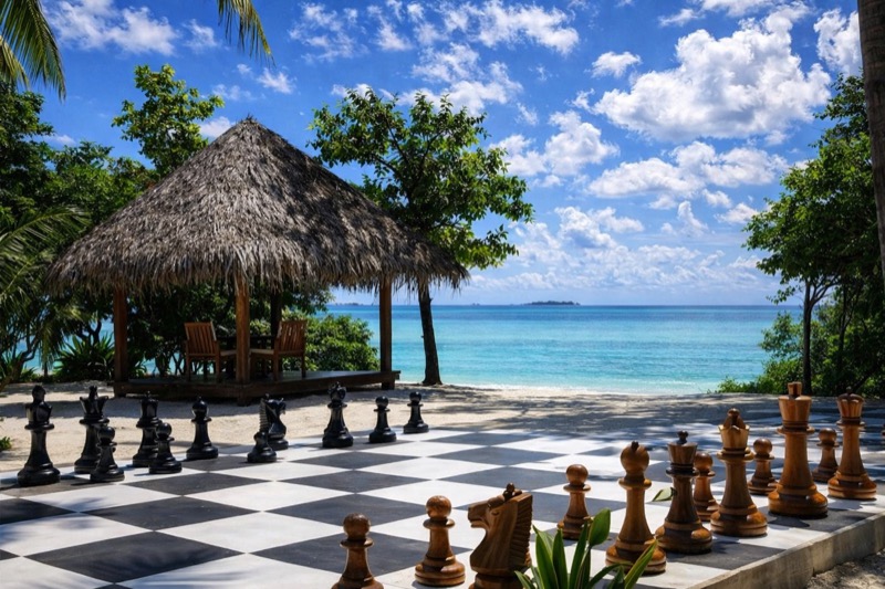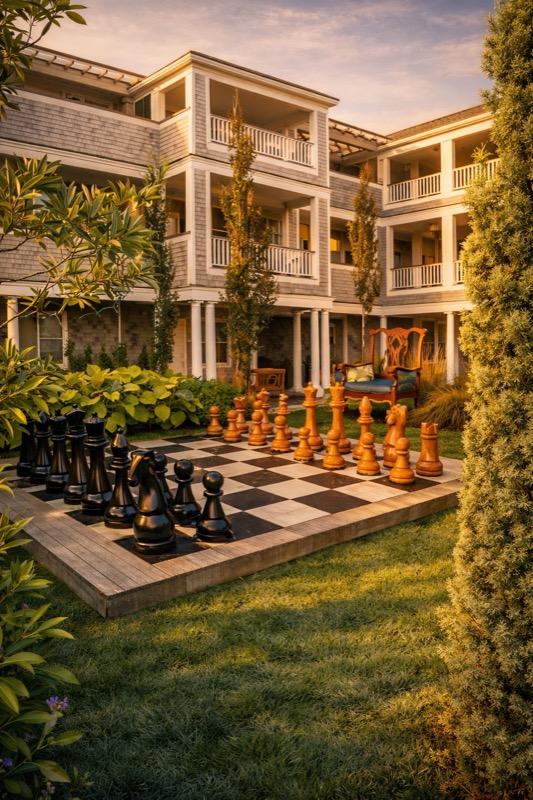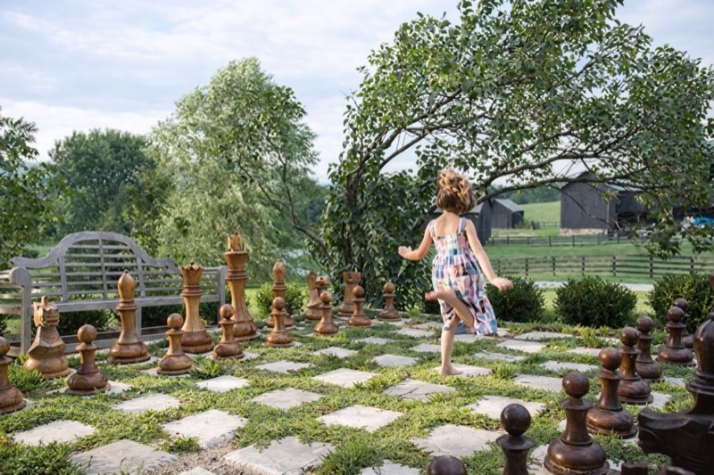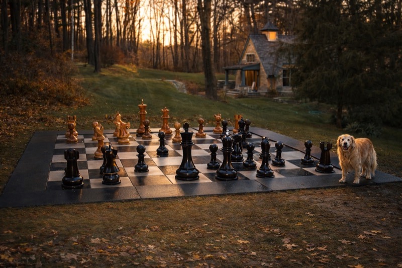The playing surface for this chess set is a chessboard with 18" x 18" squares, and is highly suited to being played by adults in various outdoor settings, and for many different occasions. Although the pieces are quite heavy, and are not easily transportable, they can be easily shifted across the squares of the board in actual play.